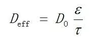 多孔電極中,除孔隙率之外,孔隙迂曲度也是與傳輸特性相關的一個重要參數。有效擴散率、傳導率等 Deff輸運物性的關系可用式(3)表示: