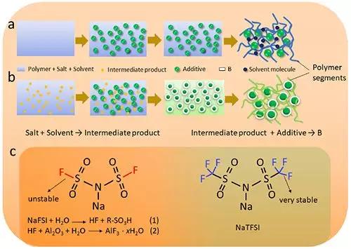 圖1.(a-b)SPE制備過程示意圖:a)傳統過程;b)所設計的過程;(c)NaFSI和NaTFSI的化學結構