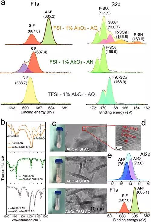 圖2. (a) FSI-1%Al2O3-AQ、FSI-1%Al2O3-AN和TFSI-1%Al2O3-AQ電解質膜的XPS圖譜;(b) Al2O3分別在NaFSI水溶液、NaFSI乙腈溶液和NaTFSI水溶液中反應后的紅外光譜;(c) Al2O3分別在NaFSI水溶液、NaFSI乙腈溶液和NaTFSI水溶液中反應離心后的照片和TEM圖;(d-e) Al2O3在NaFSI水溶液中反應離心后的高分辨TEM圖(d)和XPS圖譜(e)