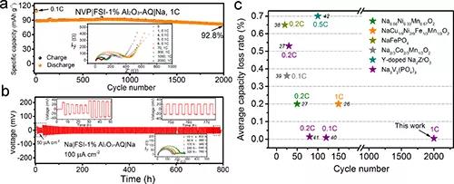 采用磷酸釩鈉(NVP)和金屬鈉(Na)分別作為正極和負極組裝固態電池NVP|SPE|Na,NVP|FSI-Al2O3-AQ|Na固態電池首周可逆比容量為110mAh/g,庫倫效率為93.8%,達到了采用液體電解質時的水平。NVP|FSI-Al2O3-AQ|Na固態電池在1C倍率下循環2000周的過程中,庫倫效率始終保持在~100%,循環2000周以后容量保持率為92.8%,平均每周容量衰減率僅為0.0036%。對金屬鈉的對稱電池在100 μA/cm2的電流密度下可穩定循環800h(圖3b)。電池循環過程中電化學阻抗譜也保持相對穩定。采用該研究工作中所設計的SPE組裝的固態鈉電池的循環穩定性是目前所報道的循環穩定性最好的聚合物固態鈉電池(圖3)。