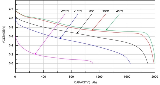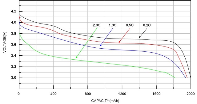 下圖顯示不同放電率下電壓與電池容量的關系。放電率愈高,電池容量愈低。溫度低時,電池容量也會降低。